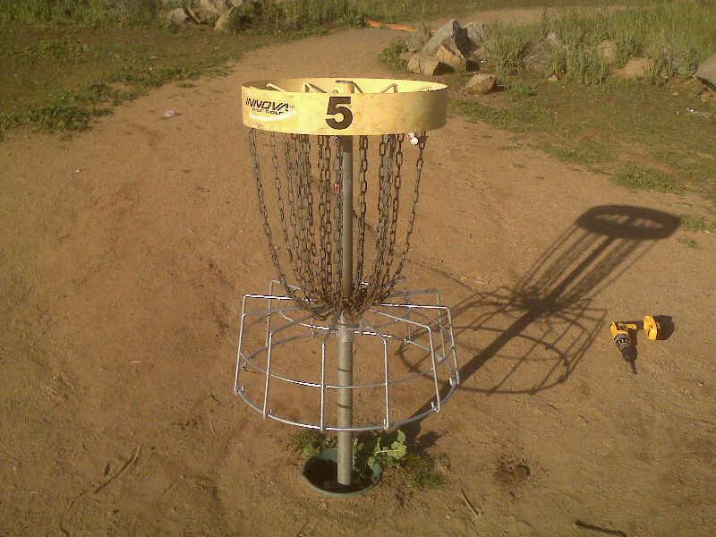 And what about the upside-down basket at Montiel? Aces member Josh Lyman was the first person to report the damage to basket #5 – someone had been leaning on the basket (and possibly jumping on it), which led to the cage breaking off of the pole. Course Rep Allen Risley arranged for a replacement cage from Innova, and the repair work was done by Aces members Mike Pearson and George Allee.