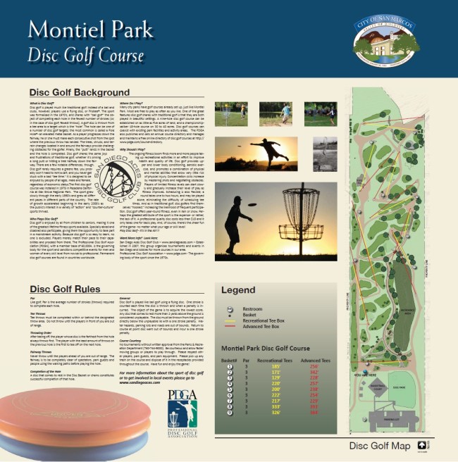 Because of the delicate condition of the new plantings at Montiel Park, we ask you to walk carefully while you play the course for the first few months. Also, be aware that there may be additional park users drawn to the garden and hiking trails, so play safely and courteously.