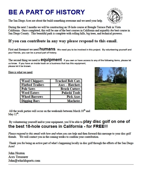 The San Diego Aces are finally ready to begin construction of the 18-hole disc golf course at Brengle Terrace Park in Vista. All of the legal steps have been taken to allow the club to get to work with an army of volunteers manning shovels, rakes, saws and clippers. The course will be built entirely by volunteers, who will be installing the 18 Innova Discatchers that the club purchased from Emerald Isle Golf Course when they ceased disc golf operations. Aces Treasurer John Heaton has been appointed to oversee the volunteer effort. John recently sent out an e-mail to all current members asking for volunteers. Contact him at John@whirldsports.com: